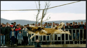 Versions: In later years, attempts to continue the tradition involved “softer” versions, such as throwing dogs into the ice cold river without the spinning mechanism, or replacing the dogs with puppets.